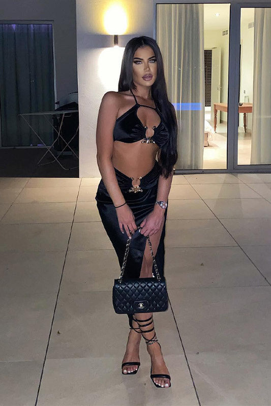 Black Hammered Trim Halter Top & Slit Midi Skirt Co-Ord
