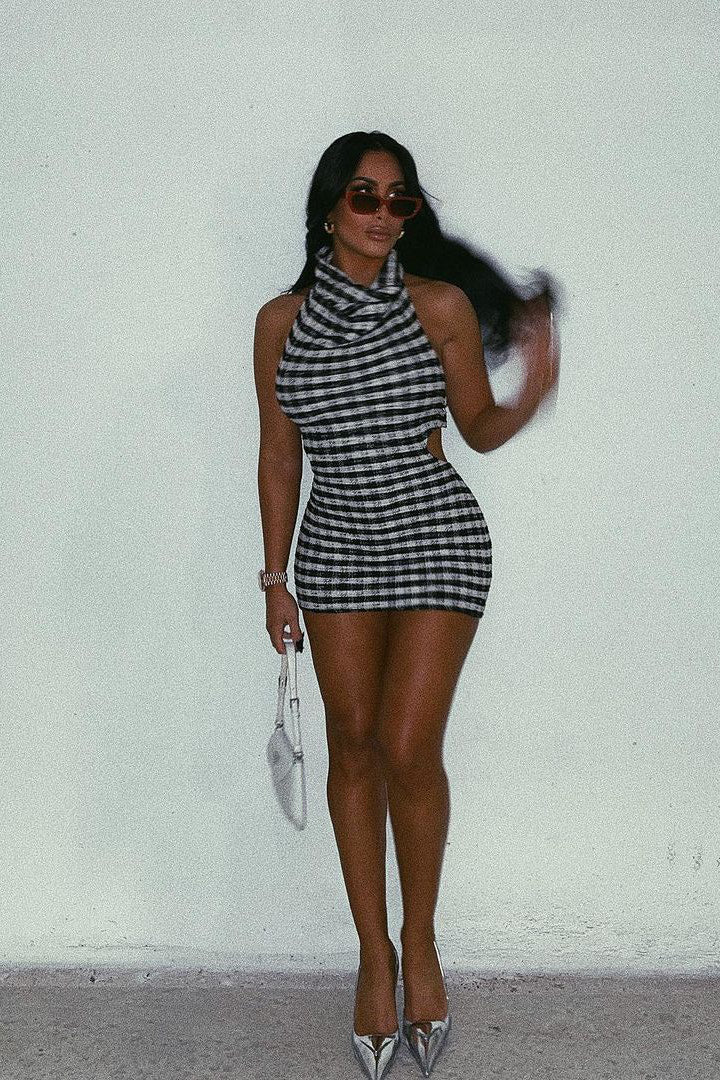 Black Tweed Print Cowl Neck Backless Mini Dress