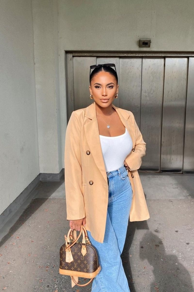 Camel Double Breasted Belted Blazer Jacket