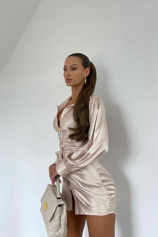 Champagne Satin Balloon Sleeve Tie Back Mini Dress
