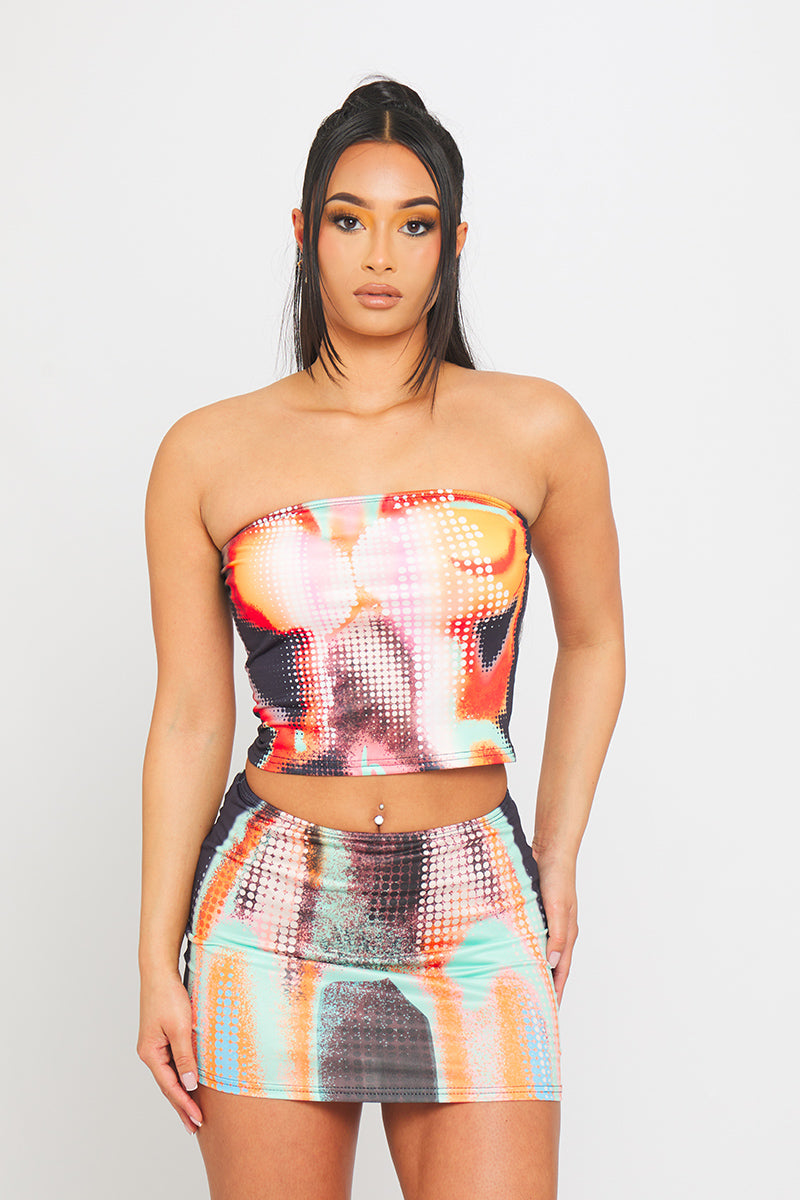 Orange Body Heat Graphic Print Bandeau Top & Mini Skirt